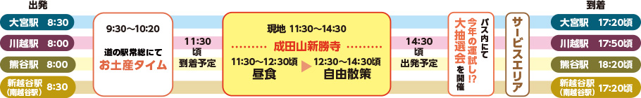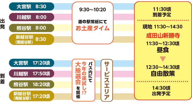 大宮駅/川越駅/熊谷駅/新越谷駅(南越谷駅) 集合後、バスにて各駅より目的地へ向かいます。