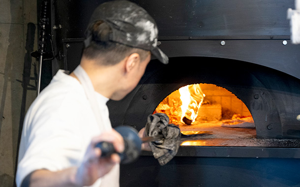 オープンキッチンにはピザ窯があり、焼き上がる様子を眺めることができます
