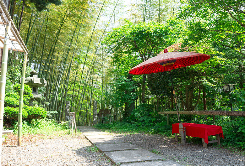 境内を包む青々とした竹林が美しい、全国でも珍しいお寺。竹林を抜けると、風情ある本堂やお堂が並び、静かな時間が流れます。境内の食事処では、竹の器に盛られた精進料理やそばなど、竹寺ならではの味も楽しめます。