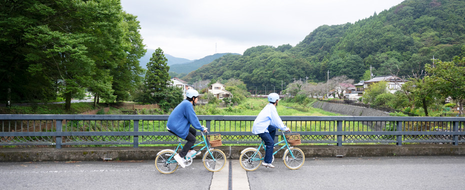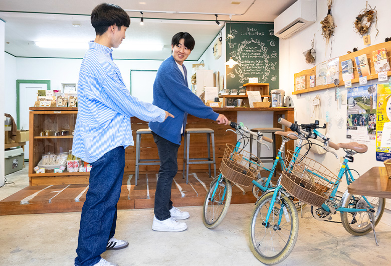 小川町駅前にある観光ステーション。地酒などのお土産が並ぶほか、レンタサイクルの貸し出しも行っています。風を感じながら、のどかな田園風景や歴史ある町並みを巡るサイクリングへ。里山の魅力を全身で感じましょう!
