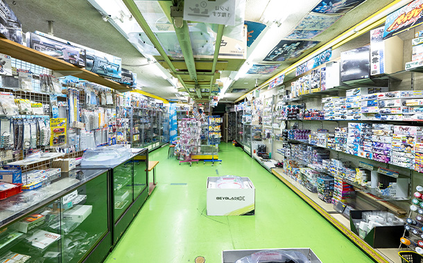 2階はプラモデル等がズラリと並び、また対戦型ホビー「BEYBLADE X(ベイブレード エックス)」を楽しむことができる対戦台も常設。近所の子どもたちの人気スポットになっています。