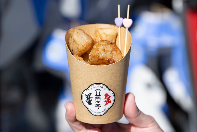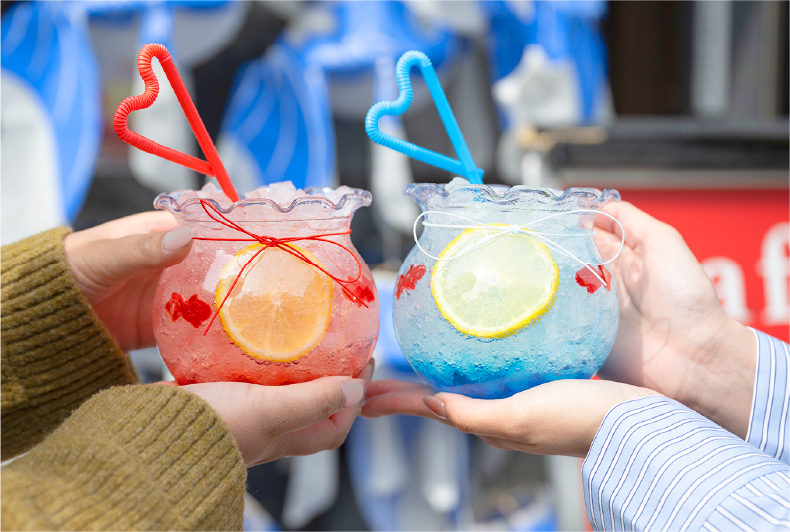 レトロな街並みに溶け込む金魚をモチーフにしたカフェ。色とりどりの金魚鉢ソーダは、そのかわいらしい見た目から、思わず写真を撮りたくなります。散策の合間に、ほっとひと息つける癒しのスポット。