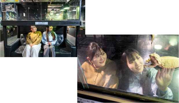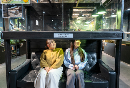 ケースの下に設置されたソファからトカゲを眺めることができるユニークな展示。生きた昆虫を追いかけるド迫力の捕食シーンを見ることもできます…!