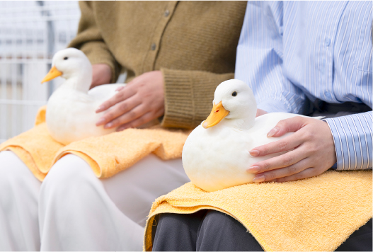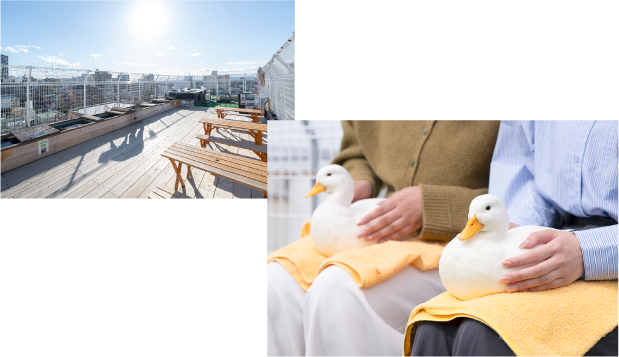 屋上では、かわいらしいコールダックと触れ合えます。思わず笑顔になる癒しの時間が、ドライブのひとときをやさしく彩ってくれます。