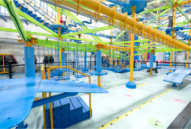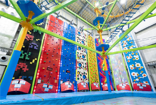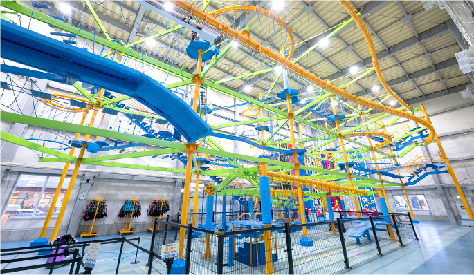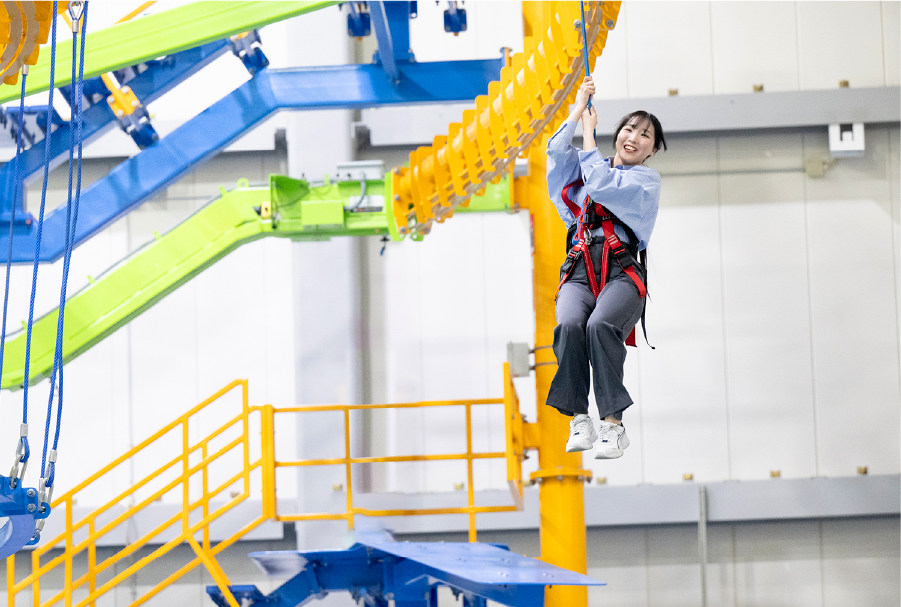 高さ11メートルの空中アスレチックや多彩なクライミングウォールに挑戦できる体験型スポット。ハーネスを装着し、不安定な足場を進むスリルはまさに非日常。手に汗握るドキドキと、ゴールにたどり着いたときの達成感がクセになります。