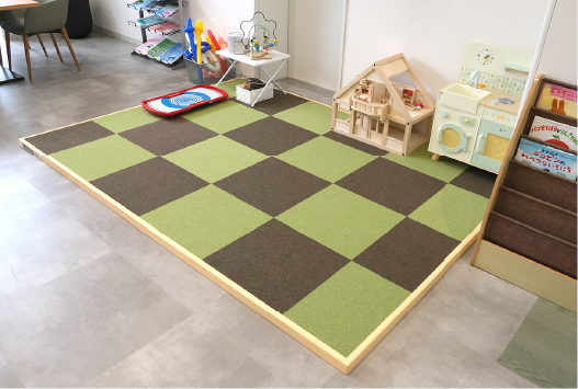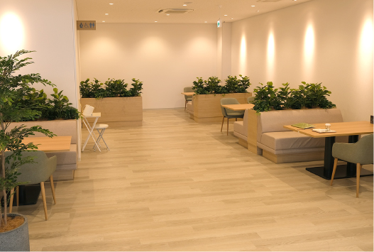 入口では「時の鐘」が刺繍された特注のマットがお出迎え。商談スペースは観葉植物を取り入れ、優しい雰囲気で広々としたレイアウトになっています。