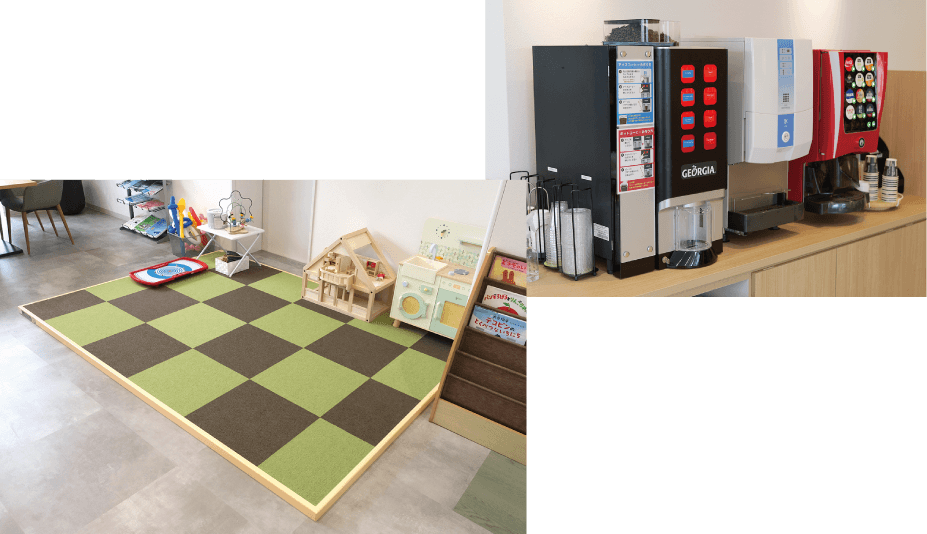 ドリンクコーナーやキッズスペースも充実!お子様から大人の方までお寛ぎいただけます。
