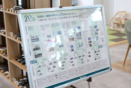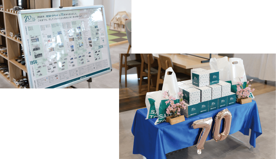埼玉トヨペット創立70周年を記念した装飾も施されています。周年を記念したイベントも随時開催!