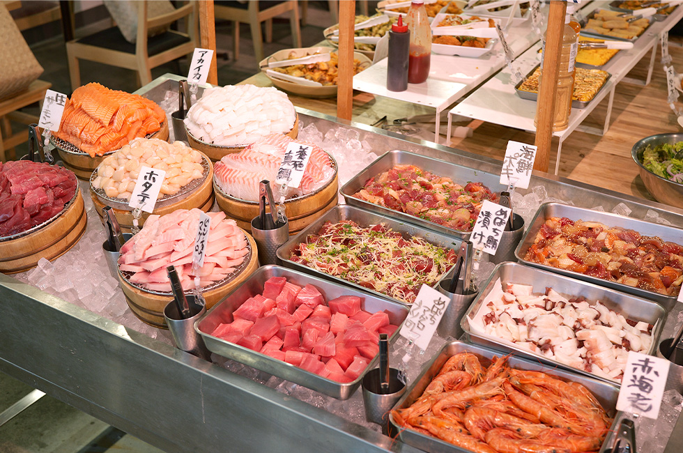 新鮮な魚介のお刺身を好きなだけ楽しめる食べ放題が魅力の海鮮食堂。種類豊富に並ぶお刺身はどれも鮮度抜群で、ついお箸が進むおいしさです。焼き魚や揚げ物、デザートなどのメニューも充実しており、最後まで飽きずに満喫できるのも魅力。まるで港町に来たかのような満足感です!