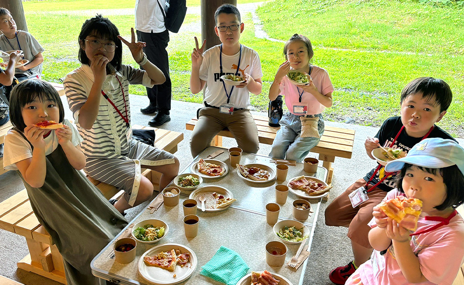 夕食は初対面の小学生参加者同士でピザ・サラダ・フルーツポンチを作り、子供たちからは「世界一おいしい!」という声も。